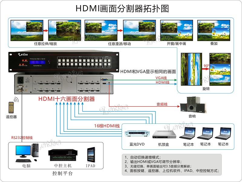 7、 支持HDMI和VGA同步输出,单画面模式下3.5音频分离解嵌;